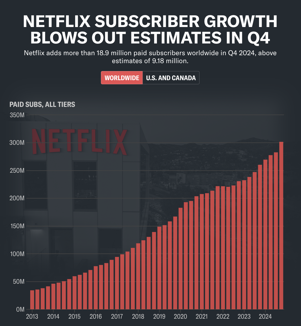 Netflix还宣布了一项150亿美元的股票回购计划,并上调了全年营收预期,预计2025年营收将在435亿美元至445亿美元之间,高于之前预测的430亿美元至440亿美元。