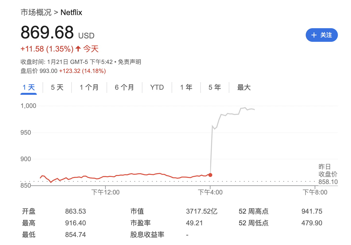 报告发布后,Netflix股价在周二盘后交易中上涨逾14%。