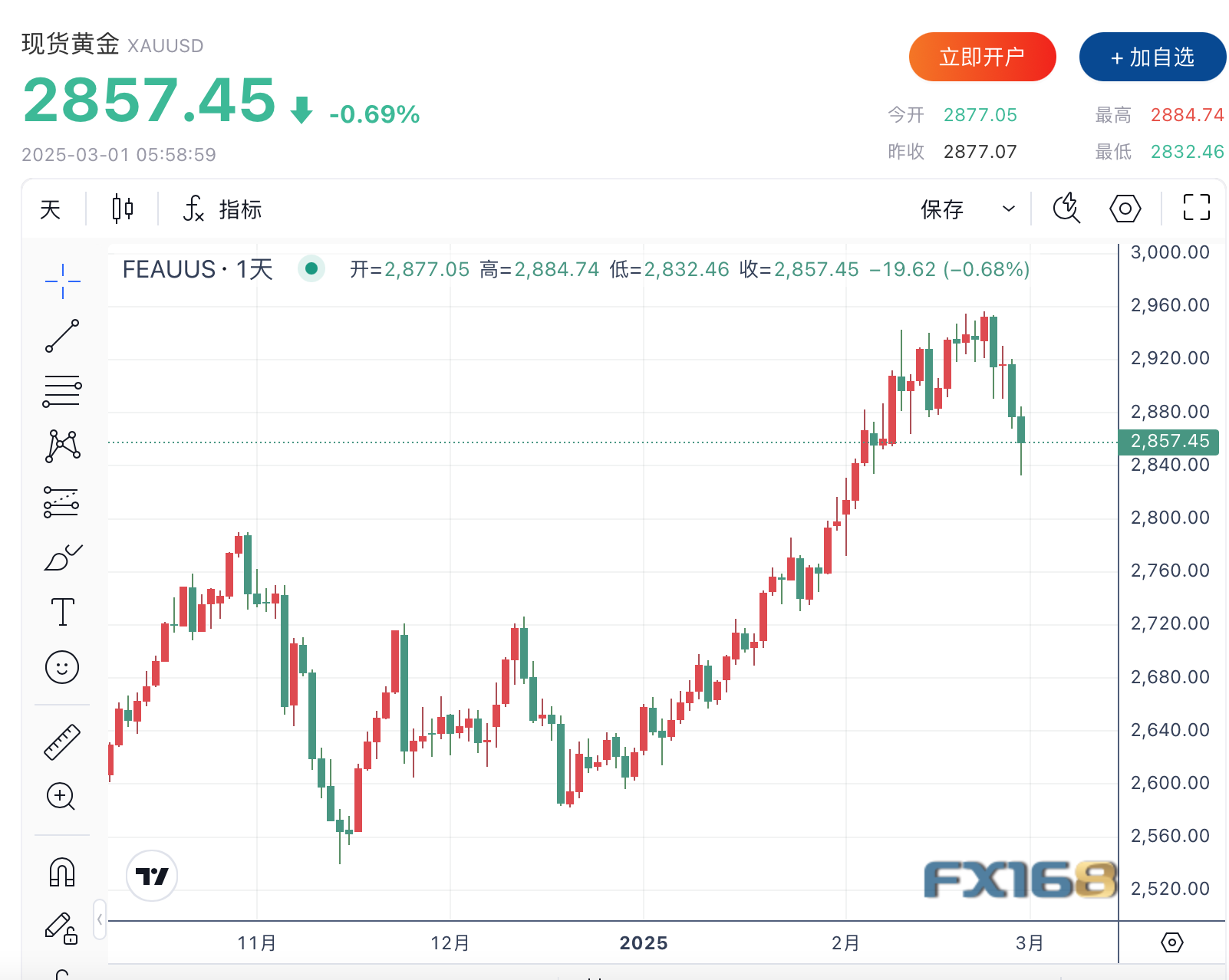 现货黄金收跌0.69%,收报2857.45美元/盎司。