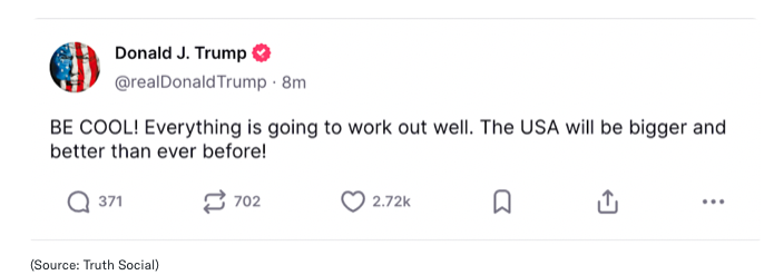 “酷一点!”特朗普在他的社交媒体平台Truth social上写道。“一切都会好起来的。美国将比以往任何时候都更大、更好!”