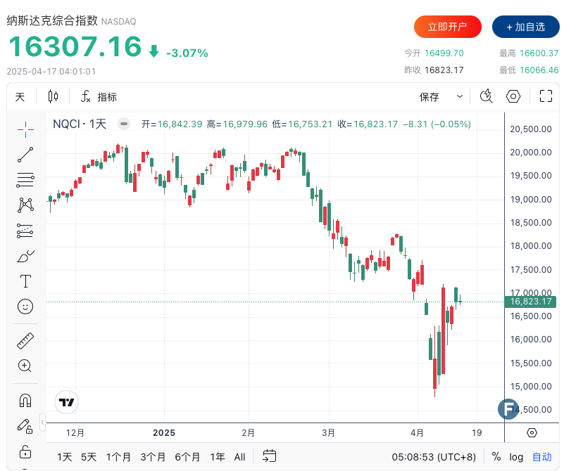 FX168财经报社(北美)讯 周三(4月16日),关税担忧再次笼罩华尔街,美联储主席杰罗姆·鲍威尔警告称,特朗普总统贸易政策的不确定性将带来“具挑战性”的影响。鲍威尔发表讲话后美股持续下跌,标准普尔500指数下跌2.2%以上,道琼斯工业平均指数下跌约700点,跌幅超1.7%。以科技股为主的纳斯达克综合指数下跌超过3%,因为新的芯片条款对科技股造成压力。
