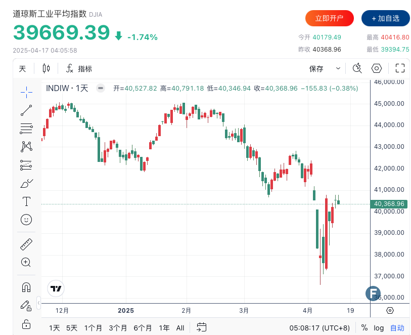 道琼斯指数收跌699.57点,跌幅1.73%,收报39669.39点;
