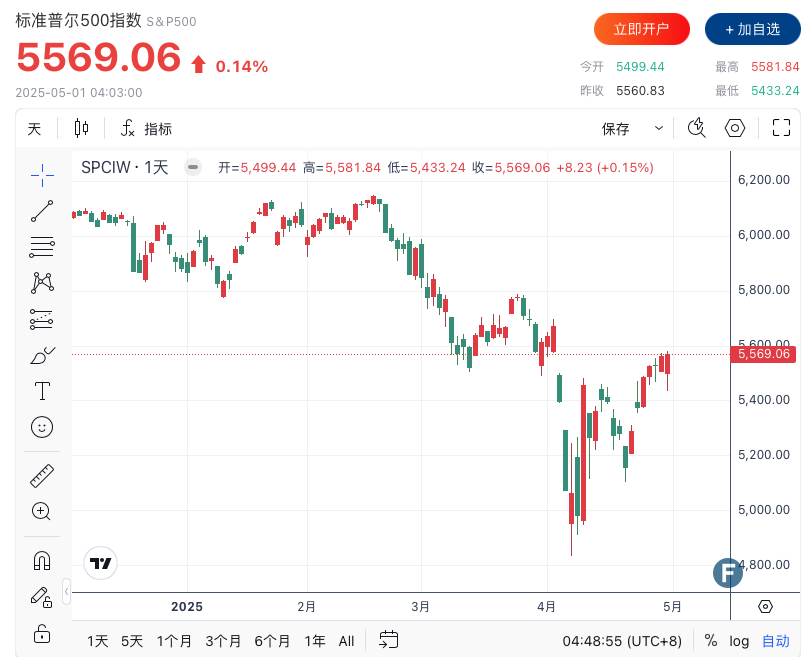 标普500指数收涨8.23点,涨幅0.15%,收报5569.06点;4月份累跌0.76%。