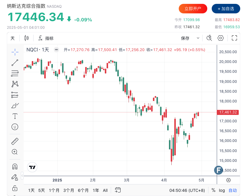 纳斯达克综合指数收跌14.98点,跌幅0.09%,收报17446.34点;4月份累涨0.85%。