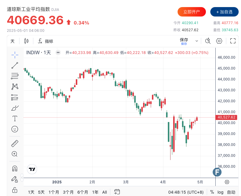 道琼斯指数收涨141.74点,涨幅0.35%,收报40669.36点,延续2025年迄今最长的连涨纪录;4月份累跌3.17%。