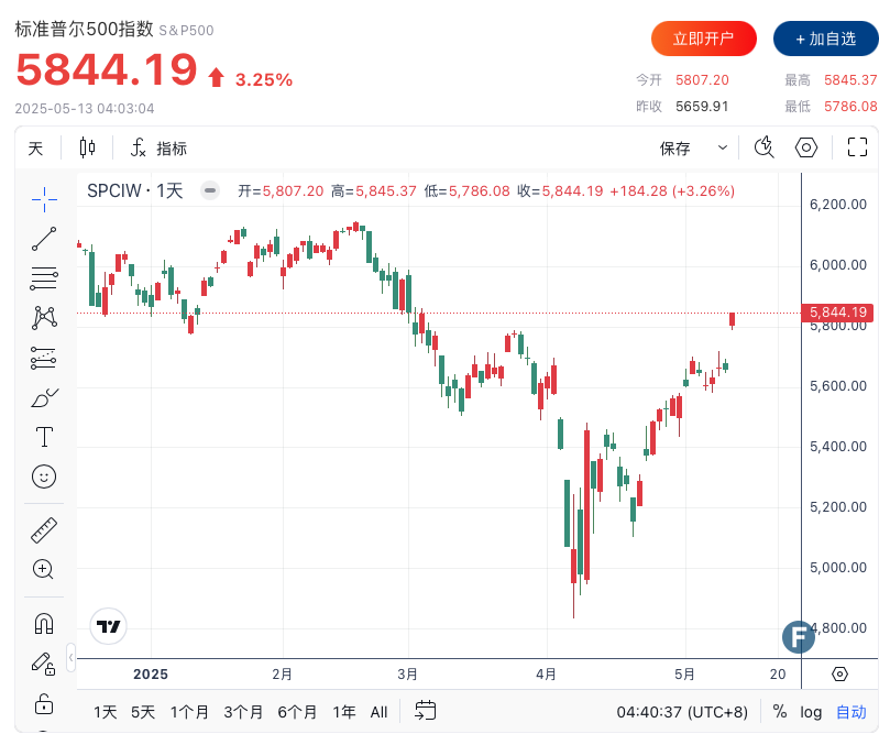 标普500指数收涨184.28点,涨幅3.26%,收报5844.19点;