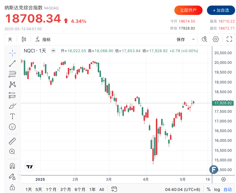 FX168财经报社(北美)讯 周一(5月12日),美国股市大幅收涨,接近盘中高点。此前中美达成协议,同意暂时削减互征关税,投资者认为中美贸易关系的突破性进展标志着贸易紧张局势显著缓和,为担心贸易战加剧的市场注入了一剂强心针。