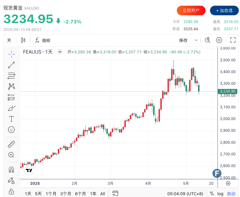FX168财经报社(北美)讯 周一(5月12日),随着美国和中国宣布削减关税的临时协议提振市场风险偏好,被市场视为避险工具的黄金下跌近3%,一度逼近3200美元/盎司。