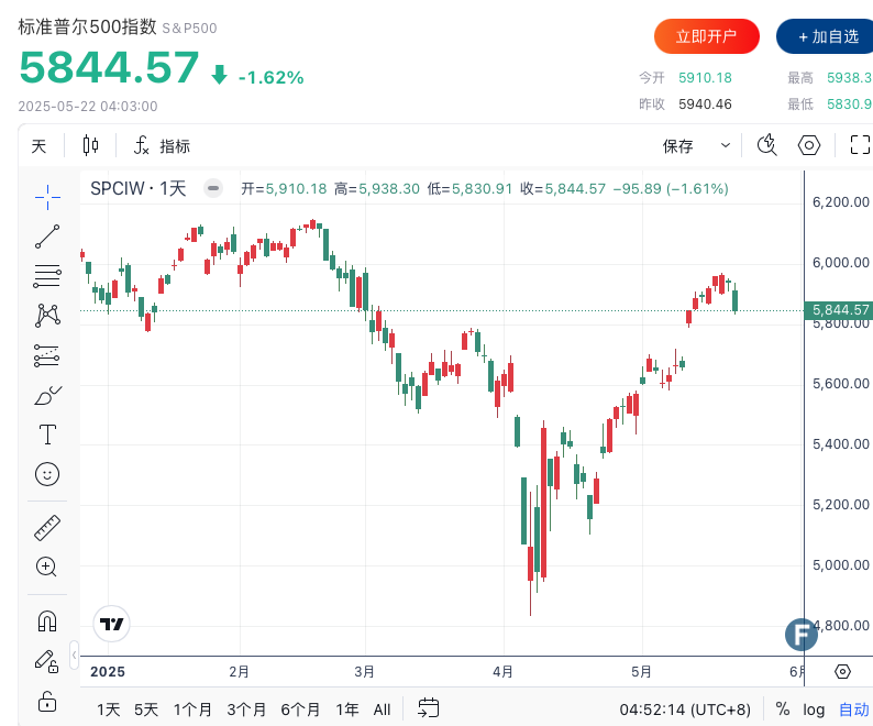 标普500指数收跌95.87点,跌幅1.61%,收报5844.59点;