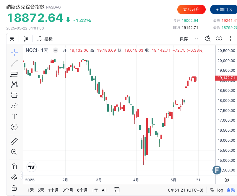 纳斯达克综合指数收跌270.07点,跌幅1.41%,收报18872.64点。