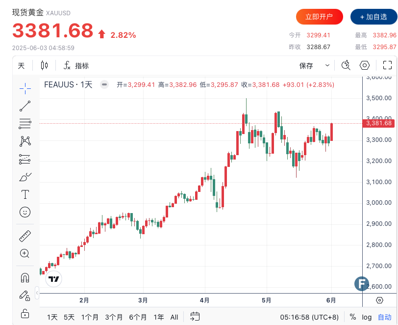 FX168财经报社(北美)讯 周一(6月2日),黄金价格飙升近3%,至三周多高点,美元走软叠加地缘政治风险与经济不确定性共同推升了投资者对避险资产的需求。