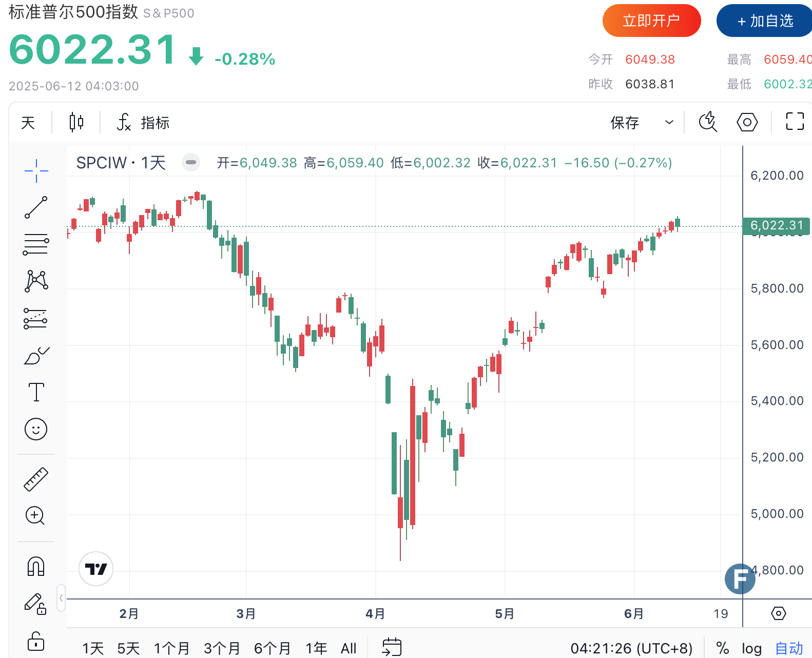 标准普尔500指数下跌16.50点,跌幅0.27%,报6,022.31点;
