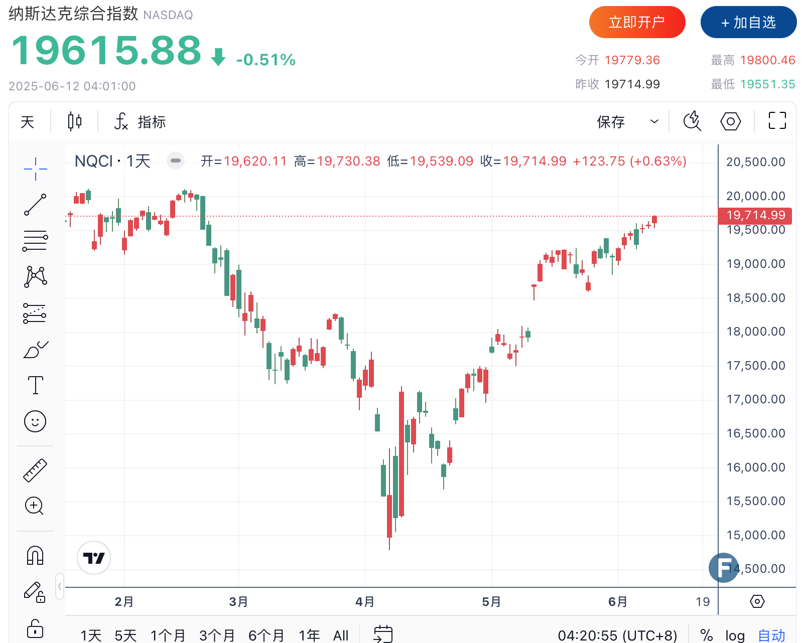 纳斯达克综合指数下挫99.11点,跌幅0.50%,报19,615.88点。