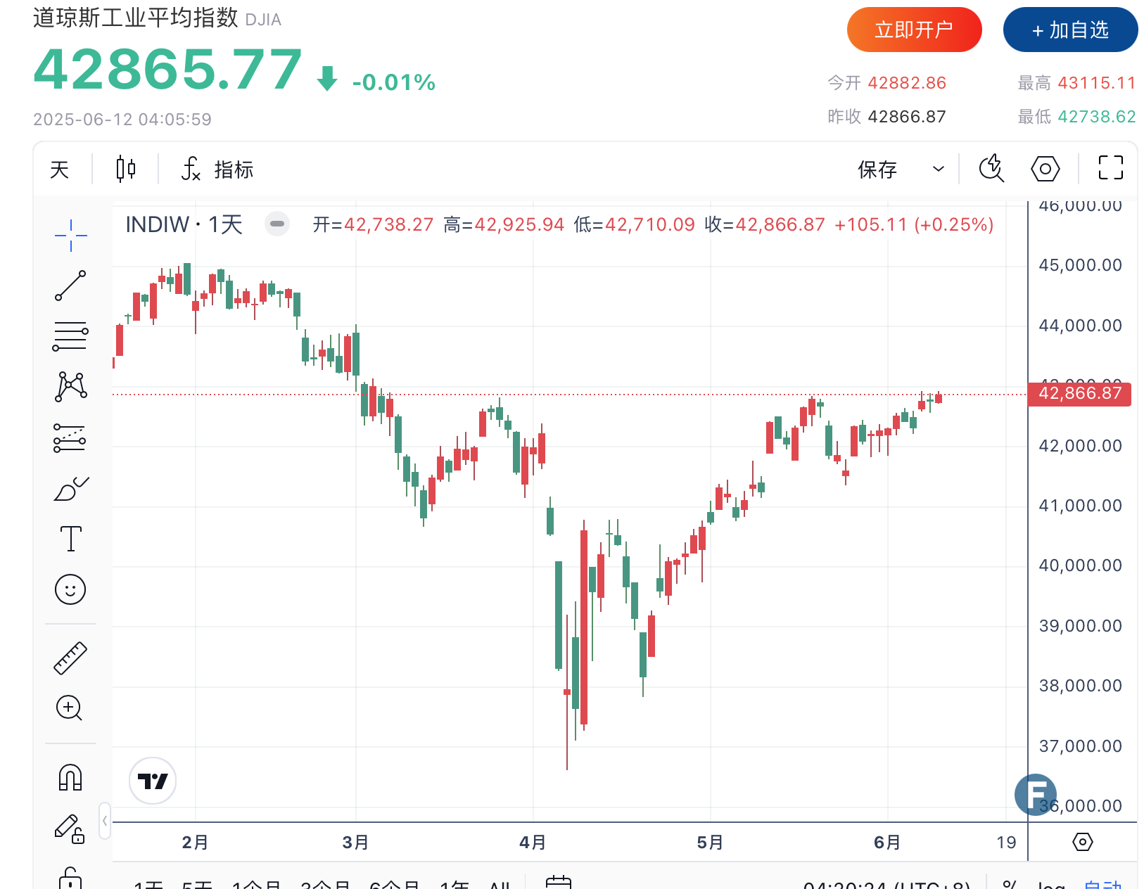 道琼斯工业平均指数微跌1.10点,几乎收平,报42,865.77点;