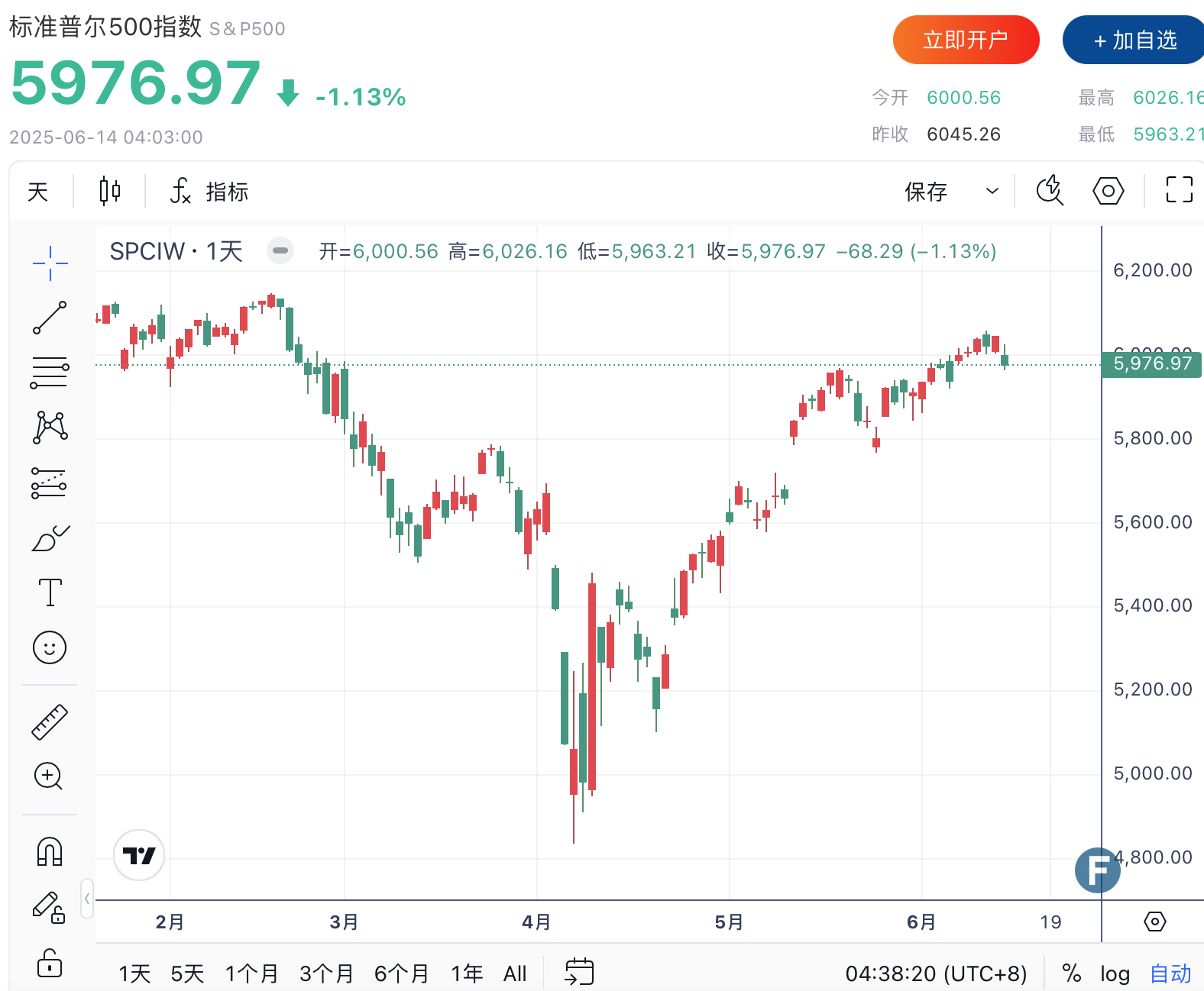 标普500指数收跌68.29点,跌幅1.13%,收报5976.97点;