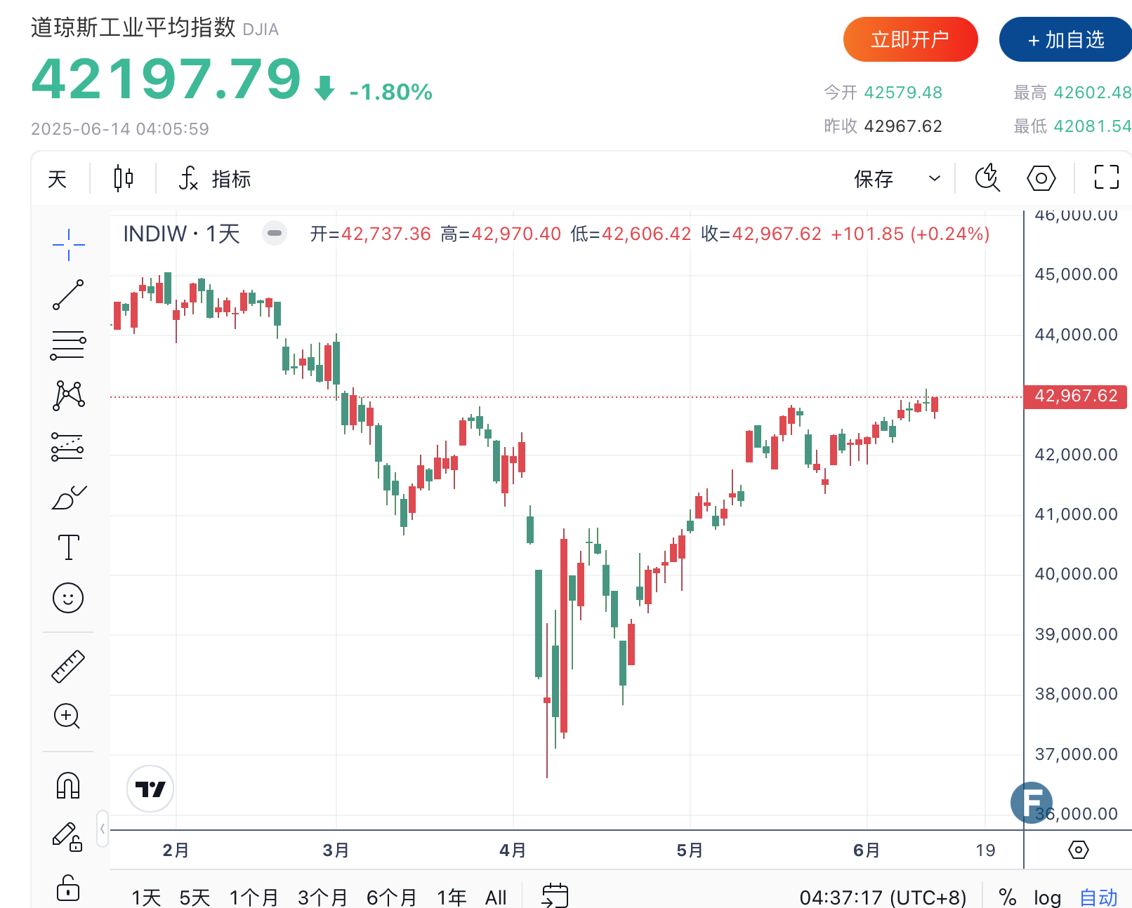 道琼斯指数收跌769.83点,跌幅1.79%,收报42197.79点;