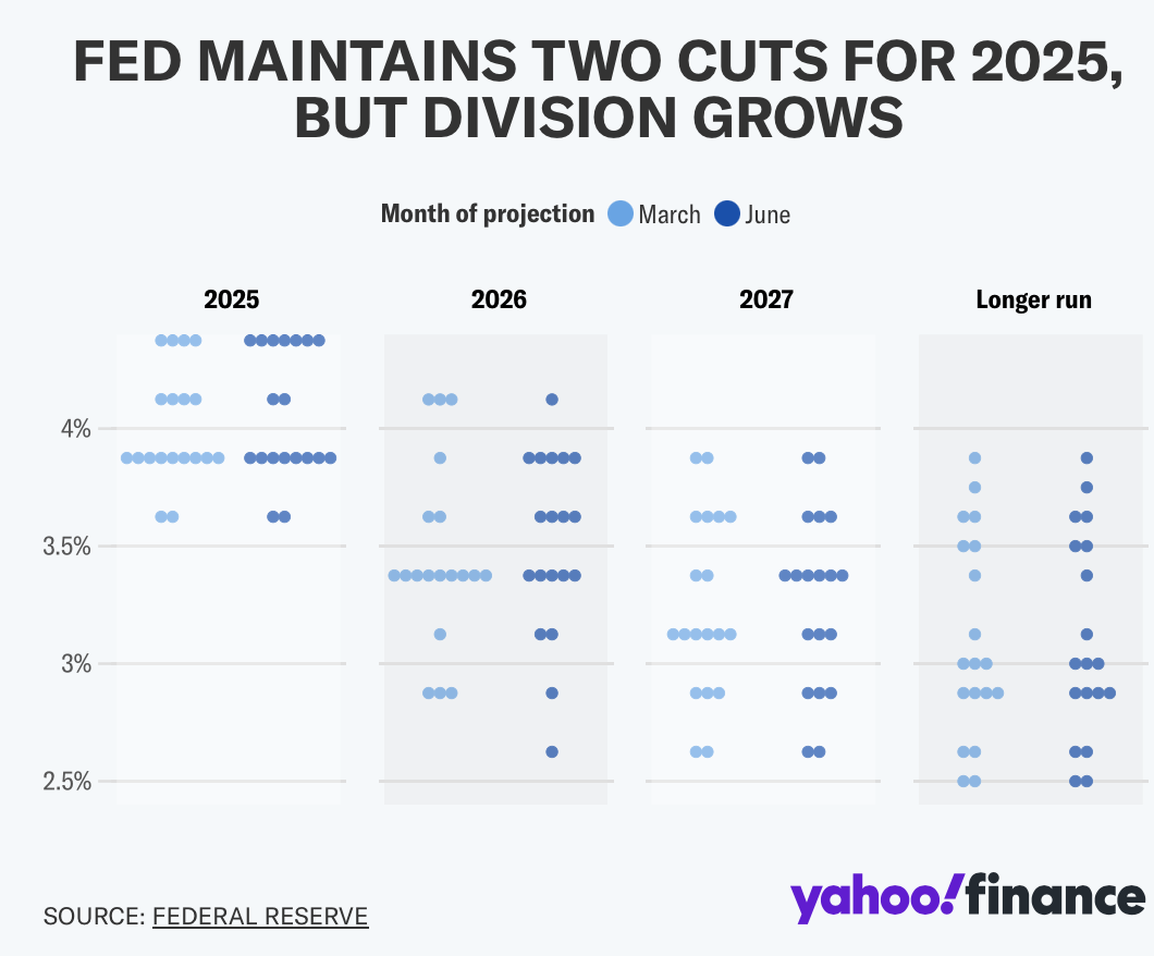 FX168财经报社(北美)讯 美联储最新公布的“点阵图”——描绘未来利率路径的预测图——显示,尽管6月预测中联储官员意见更加分化,但整体仍维持对2025年降息两次的预期,与3月展望一致。