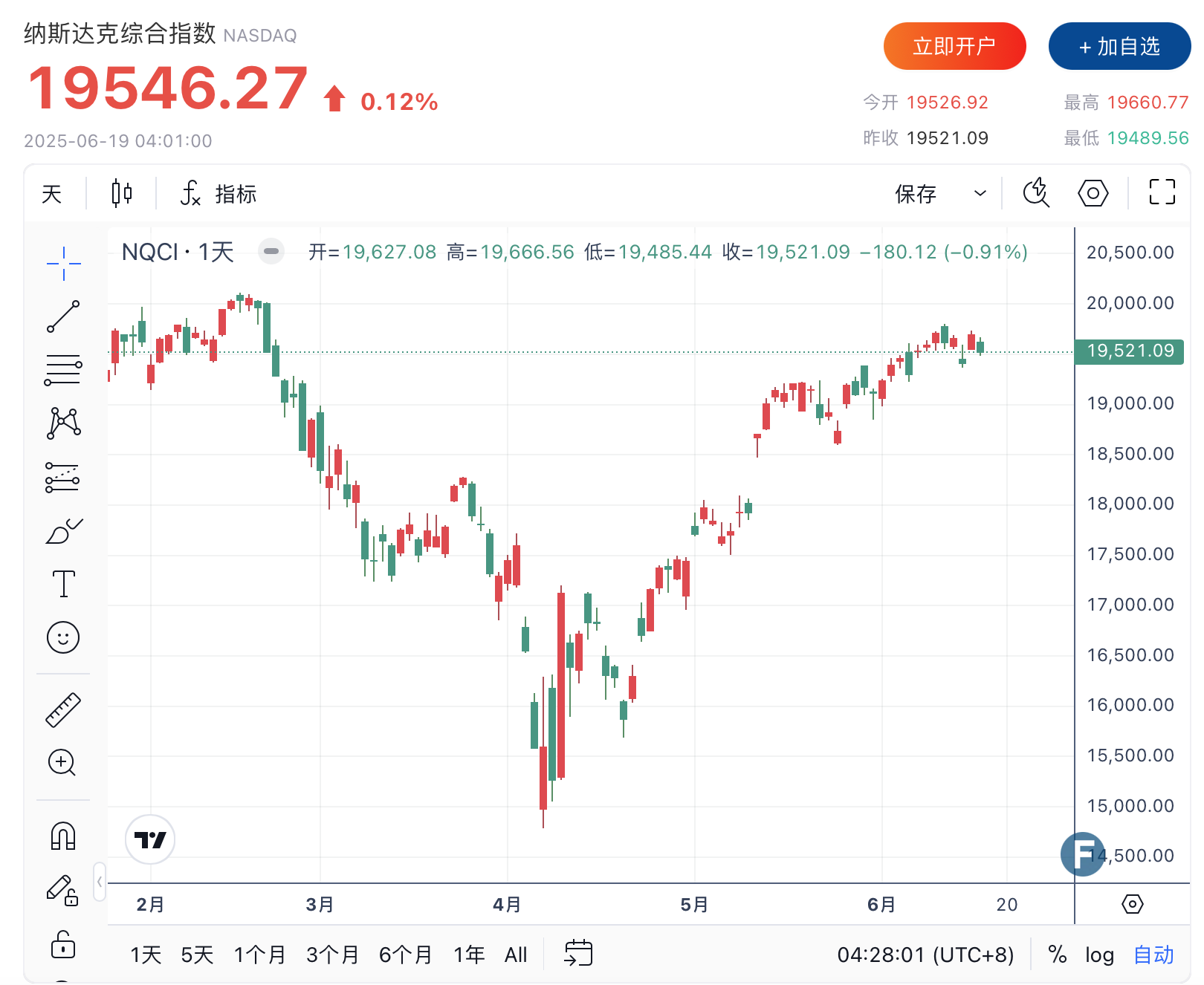 纳斯达克综合指数收涨25.18点,涨幅0.13%,报19546.27点。