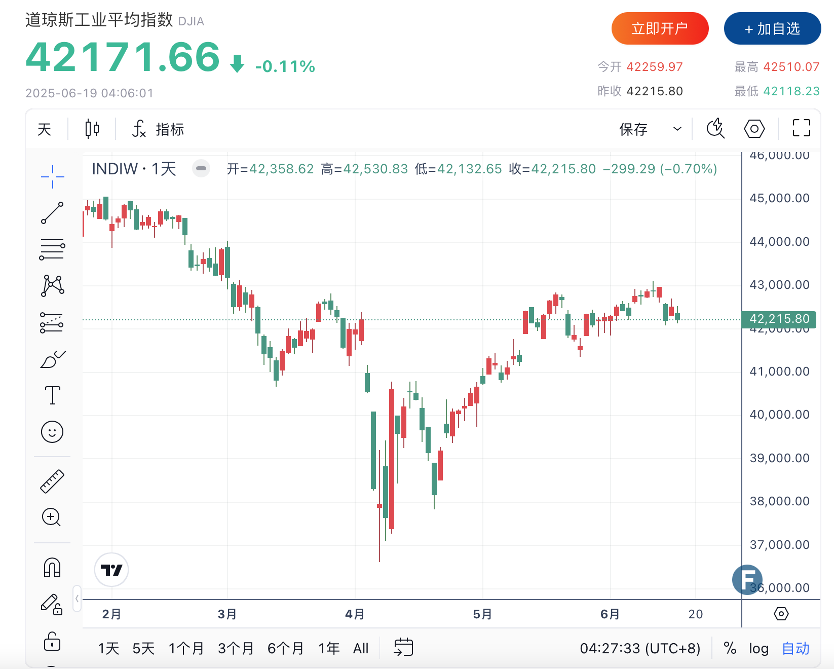 FX168财经报社(北美)讯 周三(6月18日),美联储如期公布最新利率决议并维持政策利率不变。尽管“点阵图”仍指向年内降息两次,但政策制定者内部出现明显分歧。与此同时,美国或卷入中东冲突的可能性加剧了市场的不安情绪,三大股指震荡整理,最终涨跌互现。