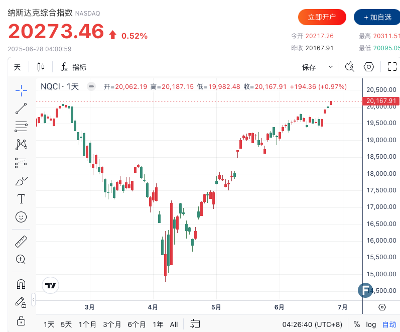 纳斯达克综合指数收涨105.55点,涨幅0.52%,报20273.46点。