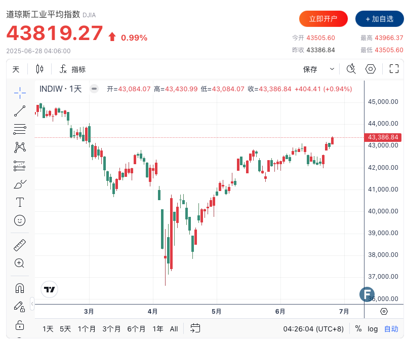 道琼斯指数收涨432.43点,涨幅1.00%,报43819.27点。