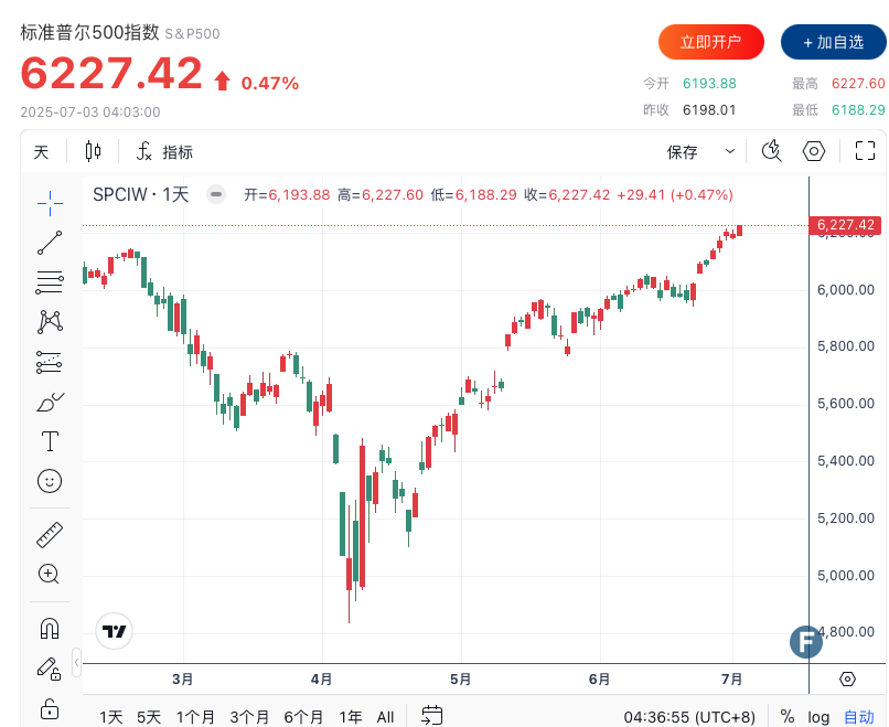 标普500指数收涨29.41点,涨幅0.47%,报6227.42点,续创历史高位;