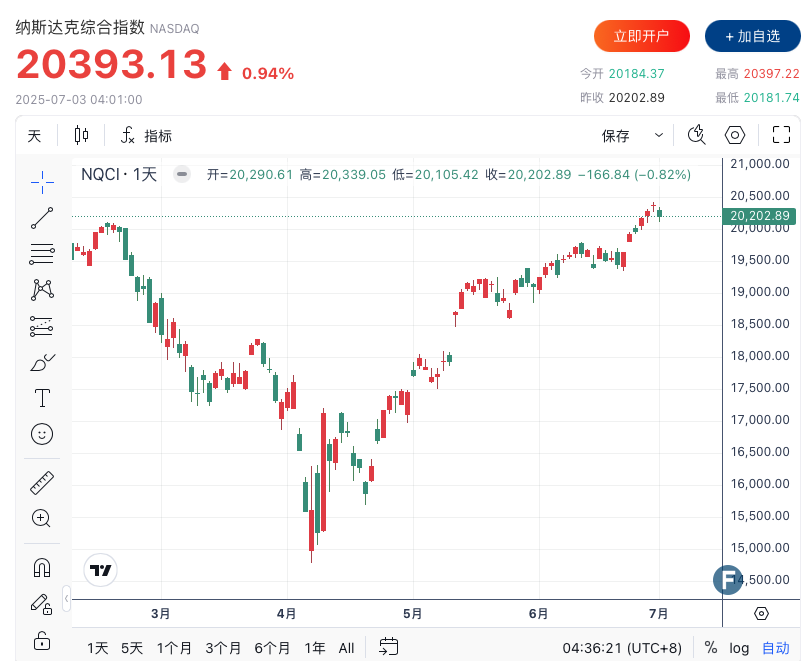 纳斯达克综合指数收涨190.24点,涨幅0.94%,报20393.13点,同样刷新纪录。