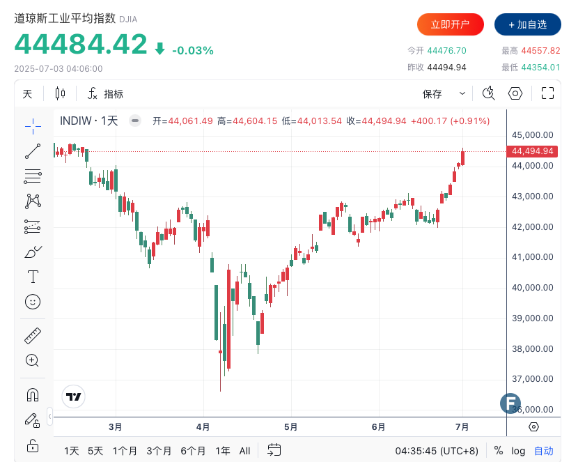 道琼斯指数收跌10.52点,跌幅0.02%,报44484.42点。