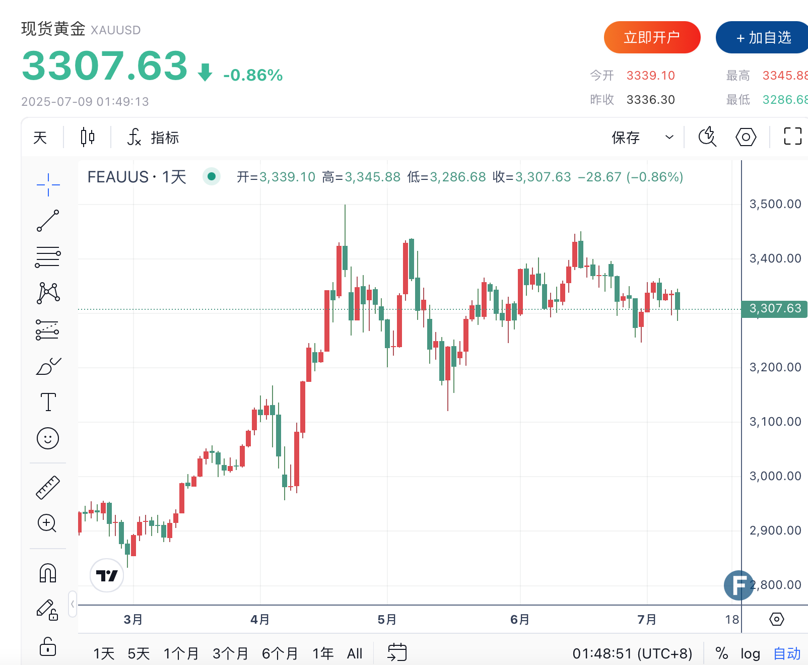 周二(7月8日),金价一度下跌1.5%,截至发稿,现货黄金价格跌0.86%,报3307.63美元/盎司。