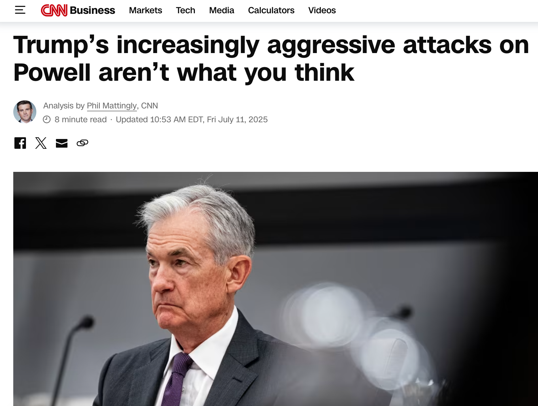 特朗普顾问们心知肚明,这轮围猎的真正目的,不是立刻撤掉鲍威尔,而是对他和FOMC施压,逼迫他们在下一次利率会议前作出“正确的选择”。