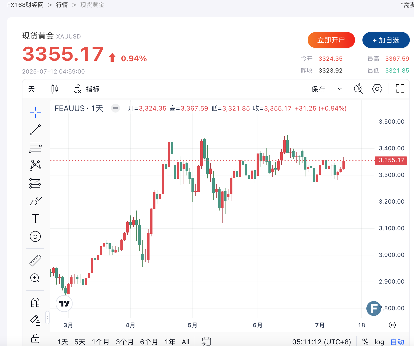 FX168财经报社(北美)讯 周五(7月11日),国际金价强势收高,日内涨幅超过1%,重返3350美元/盎司关口上方。随着美国总统特朗普再度升级关税威胁,全球避险情绪急剧升温,资金加速流入黄金等贵金属资产,白银更是一度刷新2011年以来新高,显示资金正大举拥抱避险“白色金属”。
