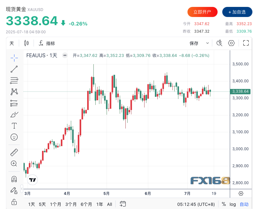 现货黄金收跌0.26%,报3338.64美元/盎司,盘中交投区间为3352.33至3309.93美元/盎司;全天交投区间为3352.33-3309.93美元,整体呈现出V形走势。