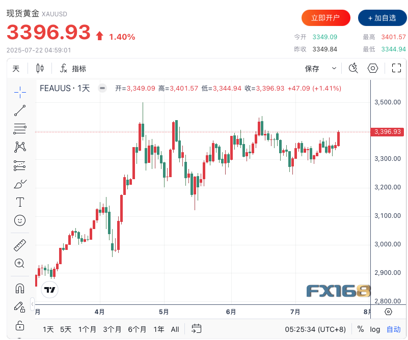 FX168财经报社(北美)讯 周一(7月21日),在美元走弱、美债收益率下行以及贸易政策不确定性加剧的多重驱动下,黄金市场再度爆发,强势突破3400美元/盎司关口,录得五周以来新高。