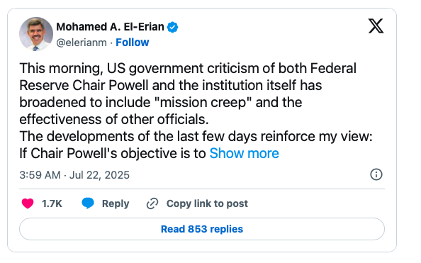 这不是危言耸听,而是主流经济学界人士对当下局势的冷静判断。前PIMCO首席执行官、知名经济学家穆罕默德·埃尔-埃利安(Mohamed El-Erian)近日在社交平台X上直言不讳地表达了自己的立场:“如果主席鲍威尔的目标是维护美联储的运作自主性(我认为这是至关重要的),那么他应该辞职。”
