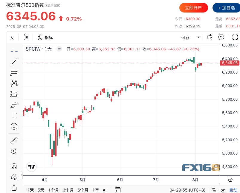 标普500指数上涨45.87点,涨幅0.73%,报6345.06点;