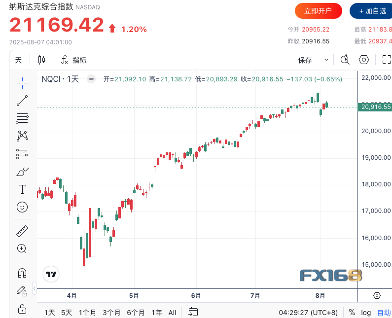 纳斯达克综合指数上涨252.87点,涨幅1.21%,报21169.42点。