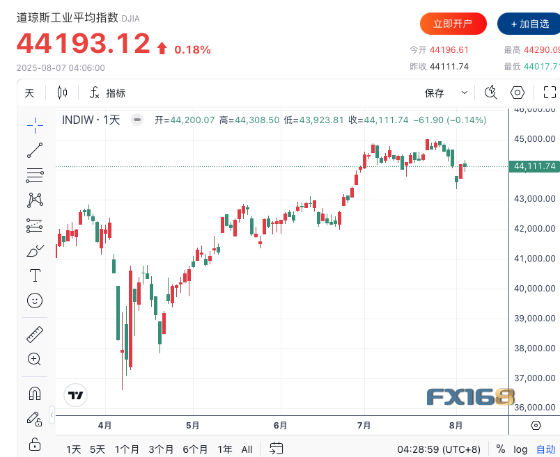 道琼斯工业平均指数上涨81.38点,涨幅0.18%,报44193.12点;