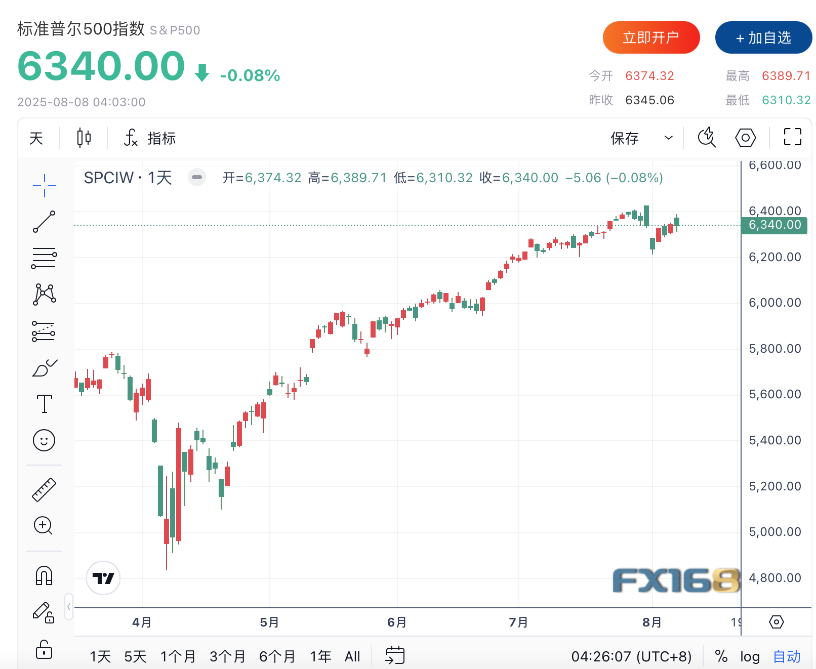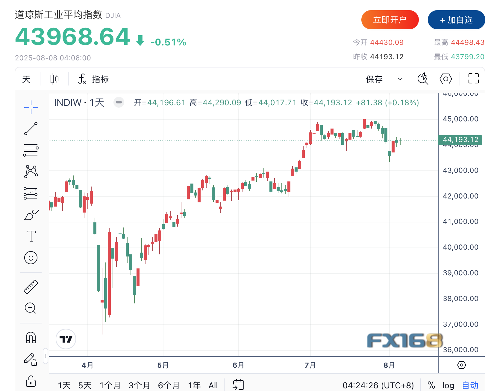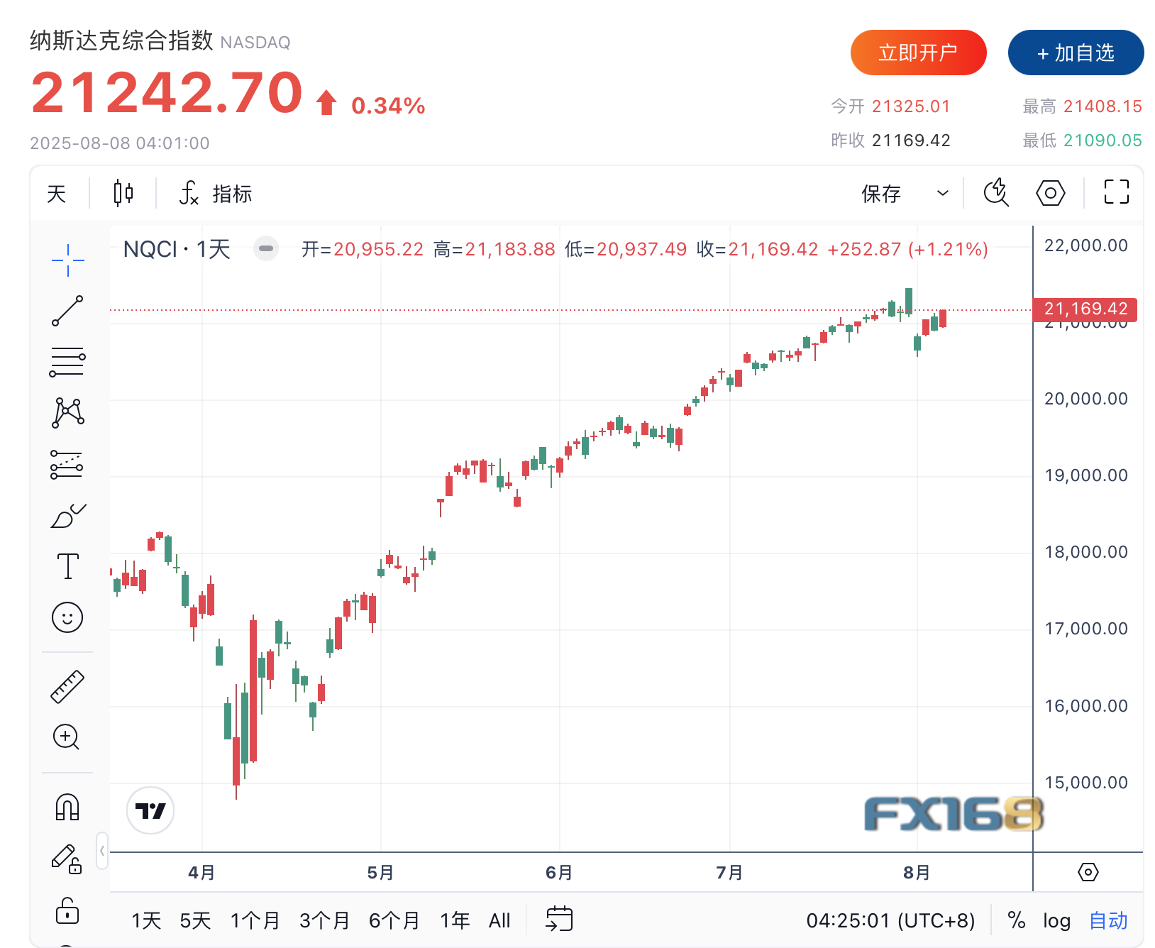 FX168财经报社(北美)讯 周四(8月7日),美股三大指数收盘涨跌不一,投资者在面对关税升级、美联储人事变动及企业财报交织影响下情绪产生严重分化。科技板块表现坚挺,纳斯达克指数延续涨势再创历史新高,苹果领涨大型科技股;而传统蓝筹股表现相对疲弱,道指显著回落。