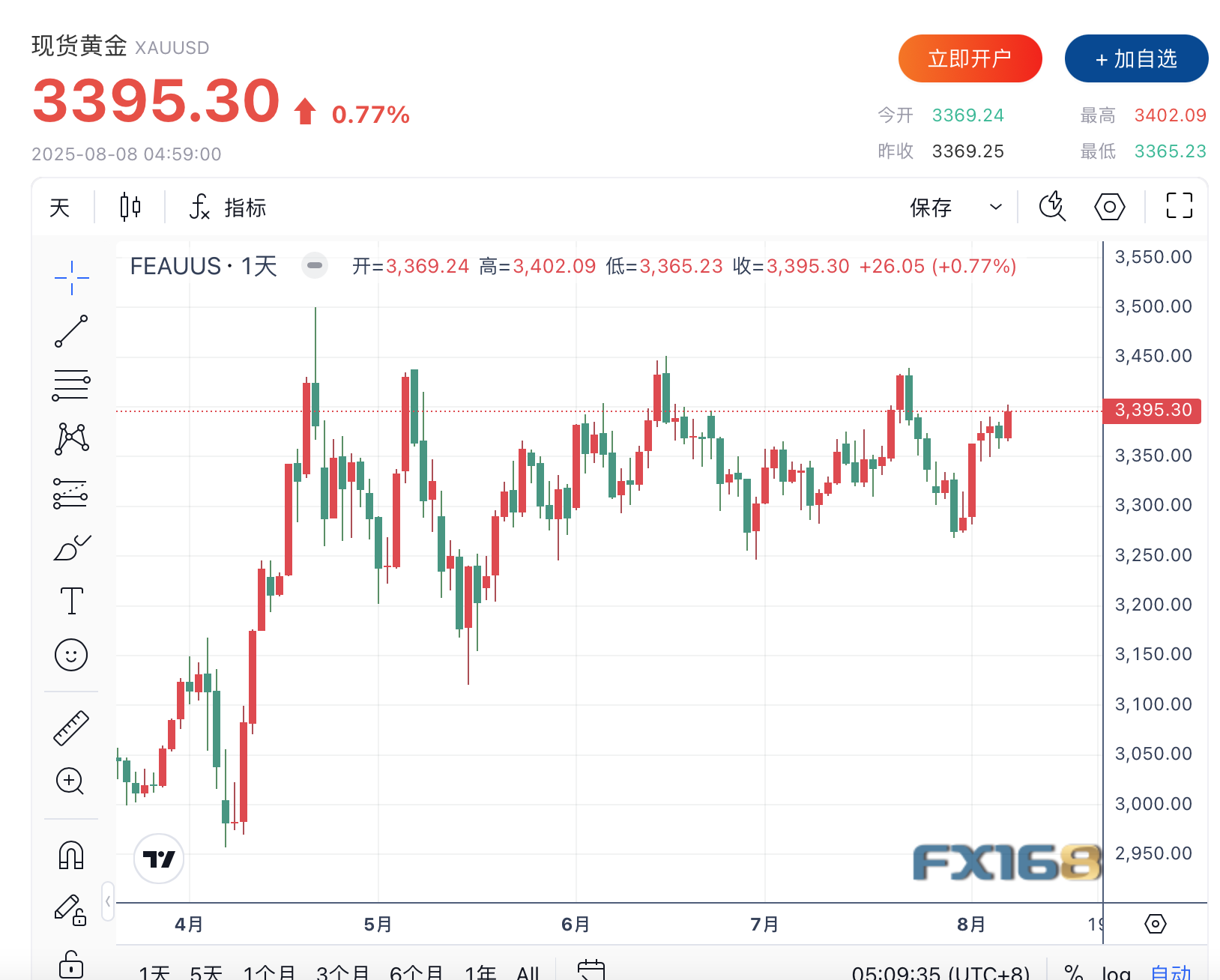 FX168财经报社(北美)讯 周四(8月7日),国际金价延续上行趋势,现货黄金创下两周新高,黄金期货亦强势收涨。市场对全球贸易紧张局势加剧、美联储9月降息的预期升温,共同推升了避险情绪和对贵金属资产的配置需求。