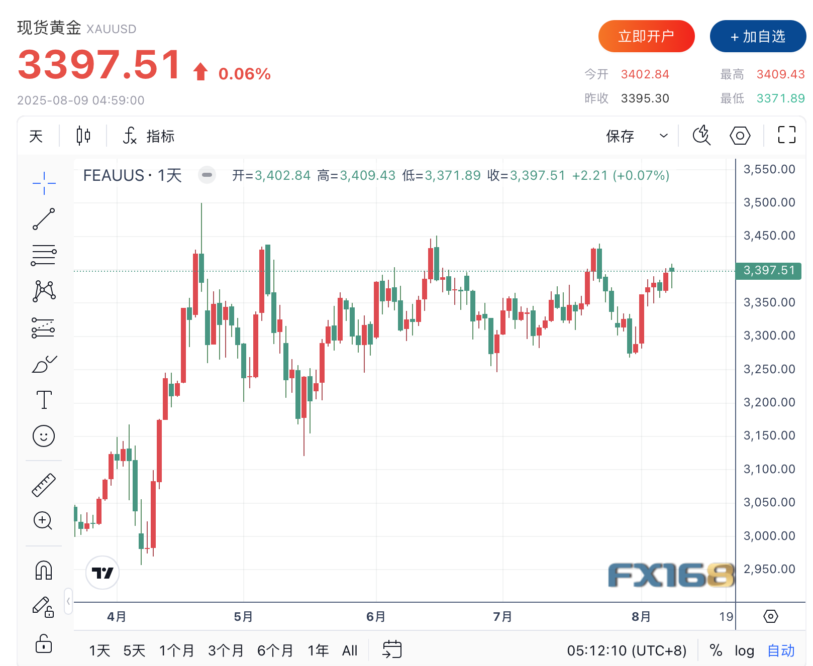 现货黄金收报3,397.51美元/盎司,日涨0.04%,本周累计上涨1.02%。