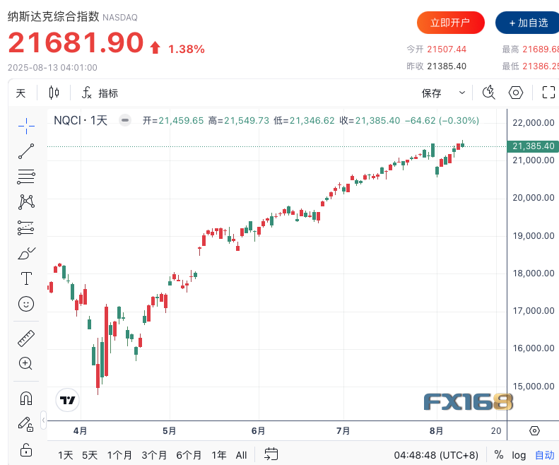 纳斯达克综合指数上涨296.50点,涨幅1.39%,报21,681.90点,刷新历史收盘纪录。