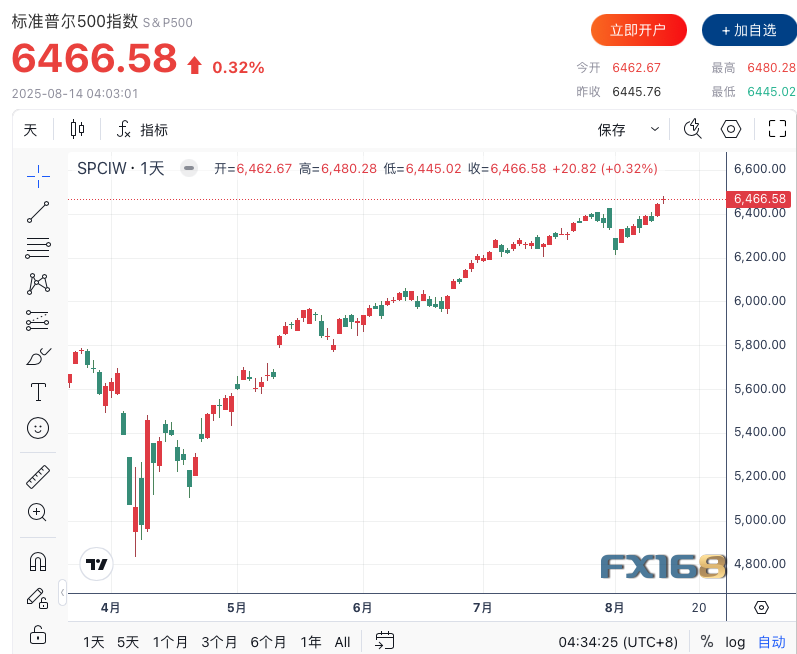 标普500指数涨0.32%,上涨20.82点,报6,466.58点,创历史新高。