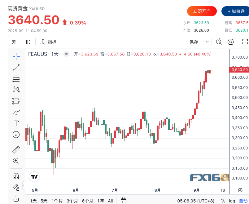 纽约尾盘,现货黄金上涨 0.39%,收报3640.50美元/盎司,距离9月9日所创的历史最高位仅一步之遥。
