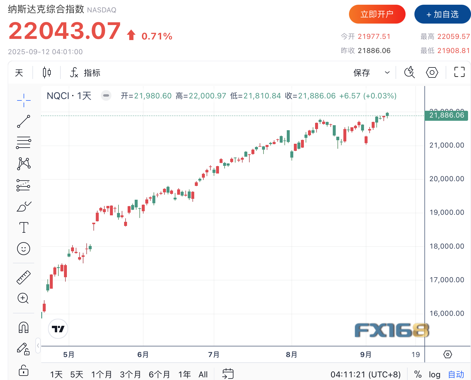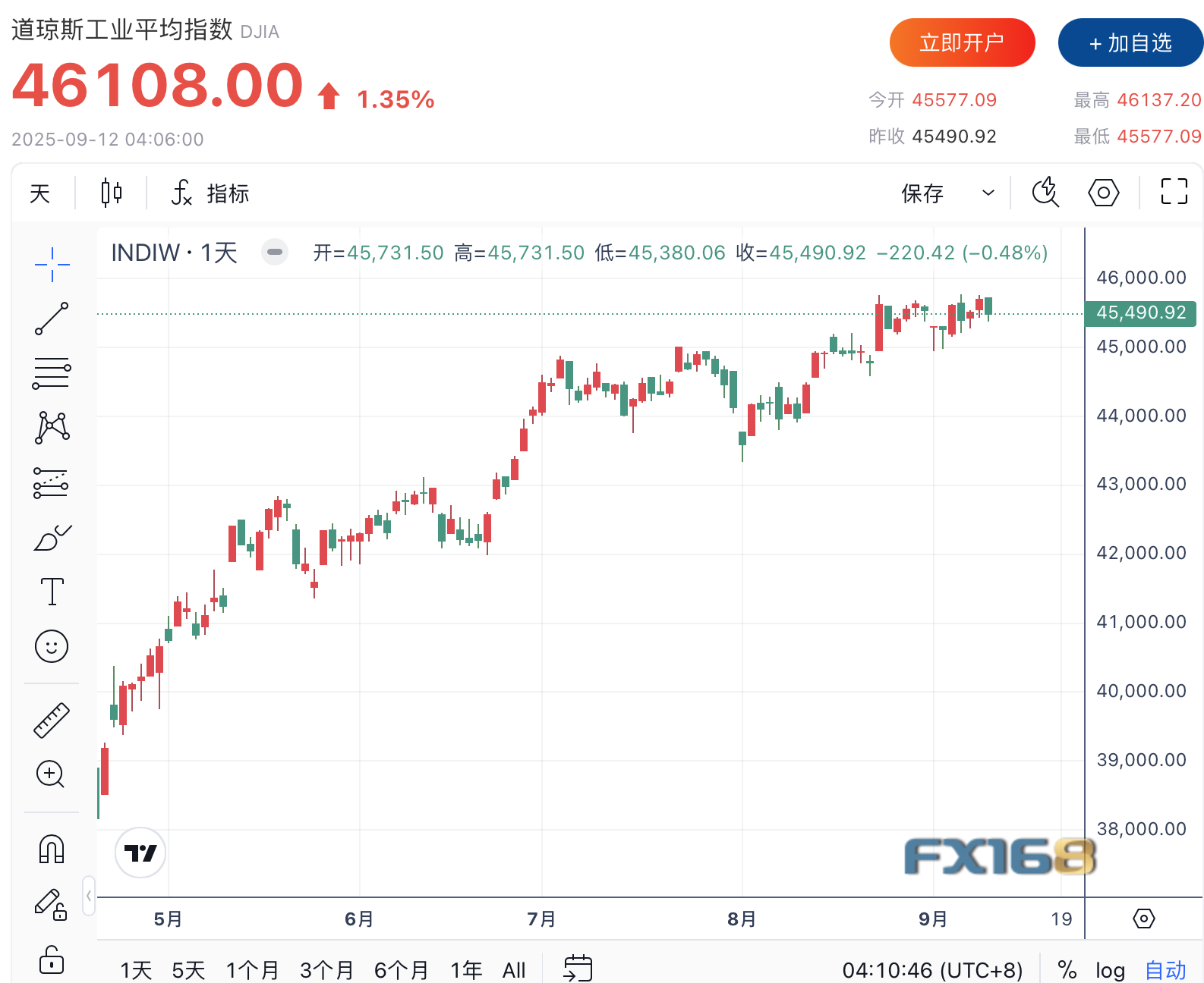 FX168财经报社(北美)讯 周四(9月11日),美股三大指数全线上涨,并再度刷新历史纪录。投资者消化最新通胀与就业数据后,普遍押注美联储将在下周会议上开启降息周期。道指首次收于46000点关口上方,标普500指数和纳指也分别突破6590点和22000点大关。