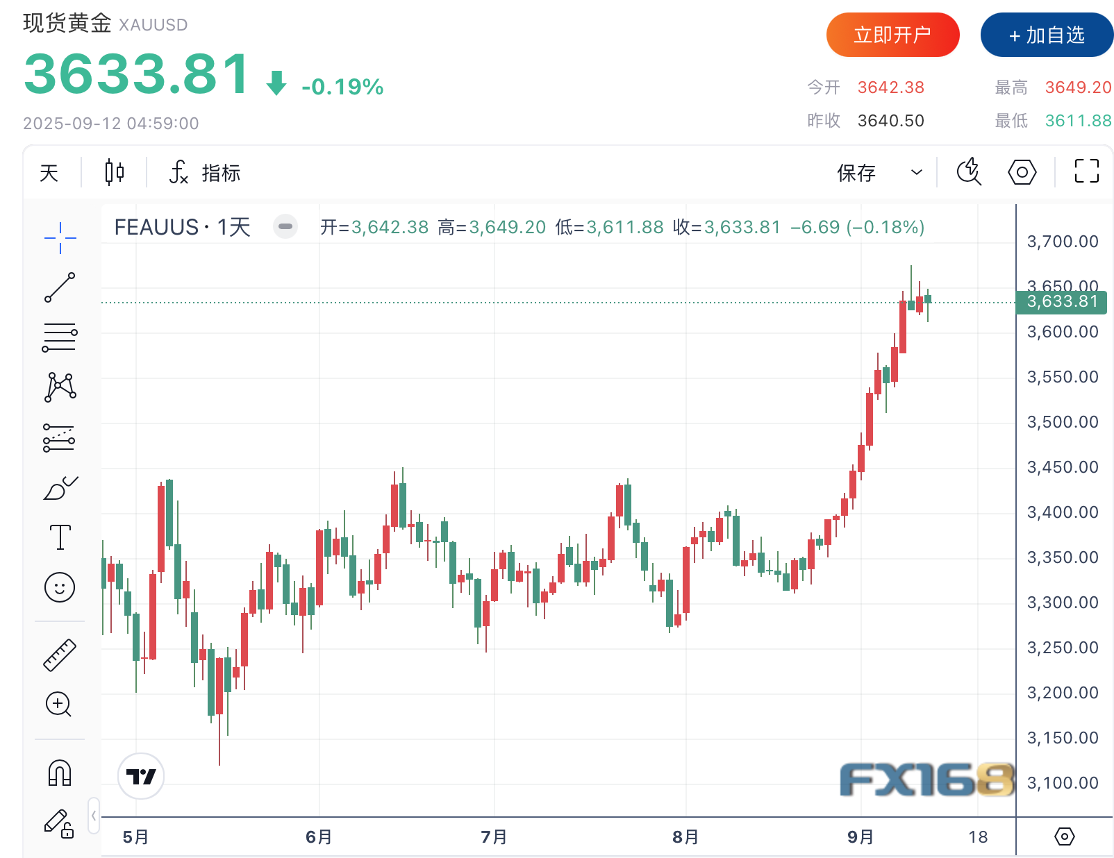 (现货黄金走势图,来源:FX168)