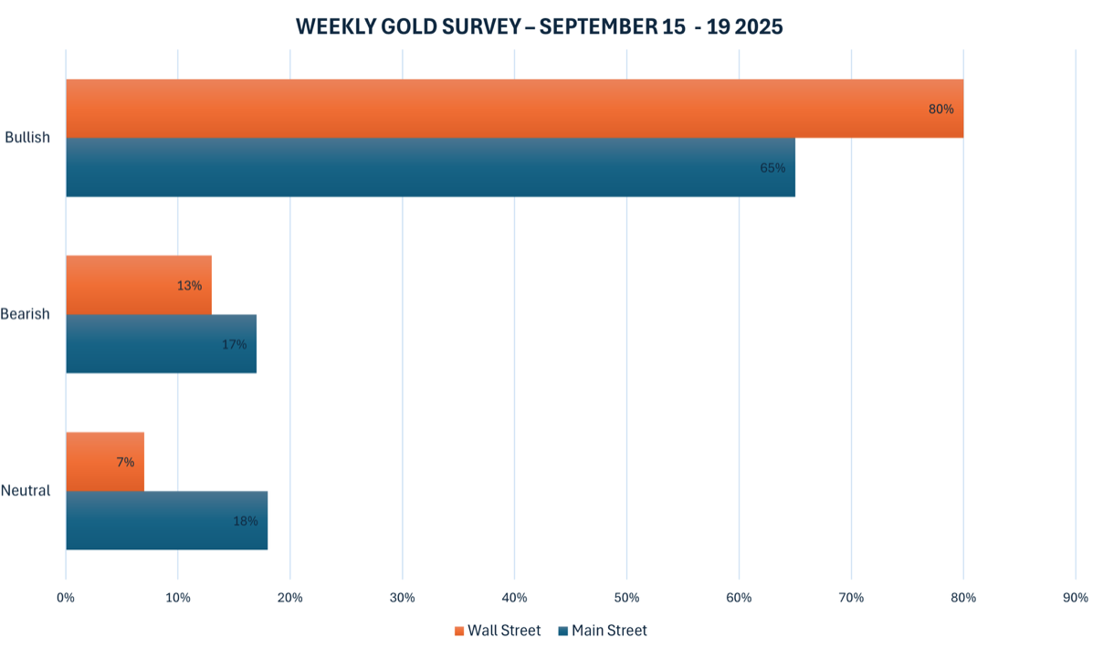 最新的Kitco News每周黄金调查显示,在预期美联储降息的背景下,华尔街情绪依然极度看涨,而在黄金近期上涨之后,大众投资者则收紧了看涨情绪。