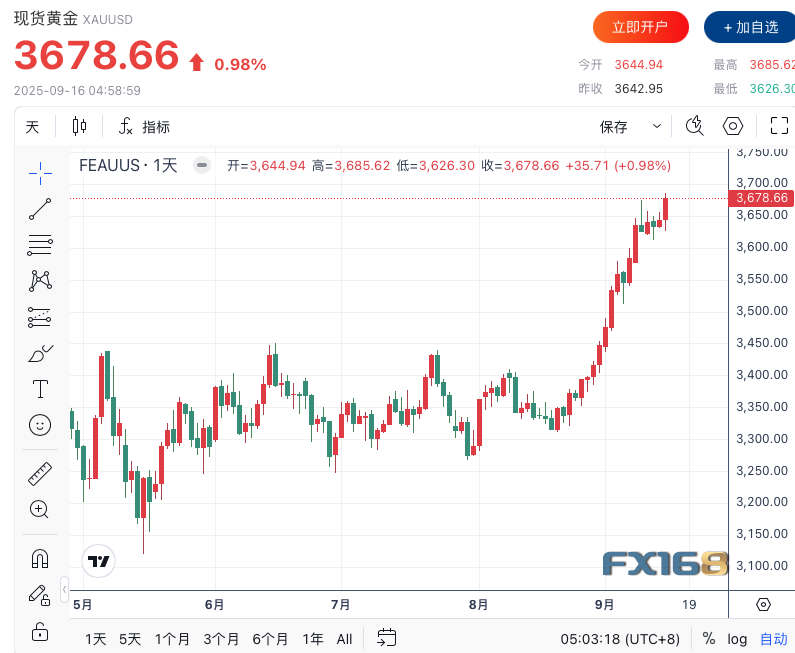 纽约尾盘,现货黄金收涨0.99%,报3,678.66美元/盎司,盘中最高触及3,685.62美元/盎司,突破9月9日创下的历史最高纪录3,674.27美元/盎司。COMEX黄金期货收涨0.93%,报3,720.70美元/盎司,盘中最高触及3,724.90美元/盎司,同样刷新纪录。