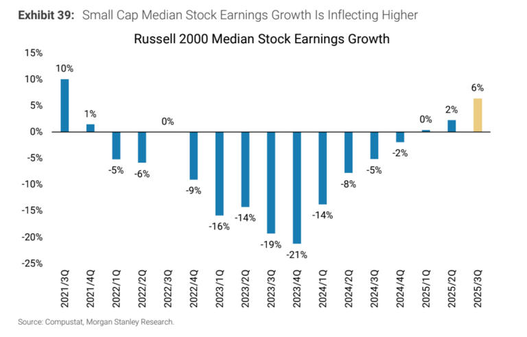 第二个重点方向是小盘股。小盘股对利率更敏感,因此更能受益于降息环境。Pauker 指出,工资增速下降也将帮助小盘公司的利润率修复。他同时提到,罗素2000指数中位数成分股的盈利增长正在回升。