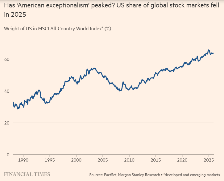 FX168财经报社(北美)讯 英国《金融时报》(Financial Times)周一(1月5日)发布2026年全球趋势展望,指出全球市场正处于一个“叙事切换”的关键窗口。文章回顾称,2025年初市场几乎形成普遍共识:唯一值得投资的国家是美国。然而,随着一年结束,国际市场以远超美股的回报表现“反向证明”美国并非唯一答案,海外市场的收益甚至达到美股的两倍,令“美国例外主义”的光环明显褪色。