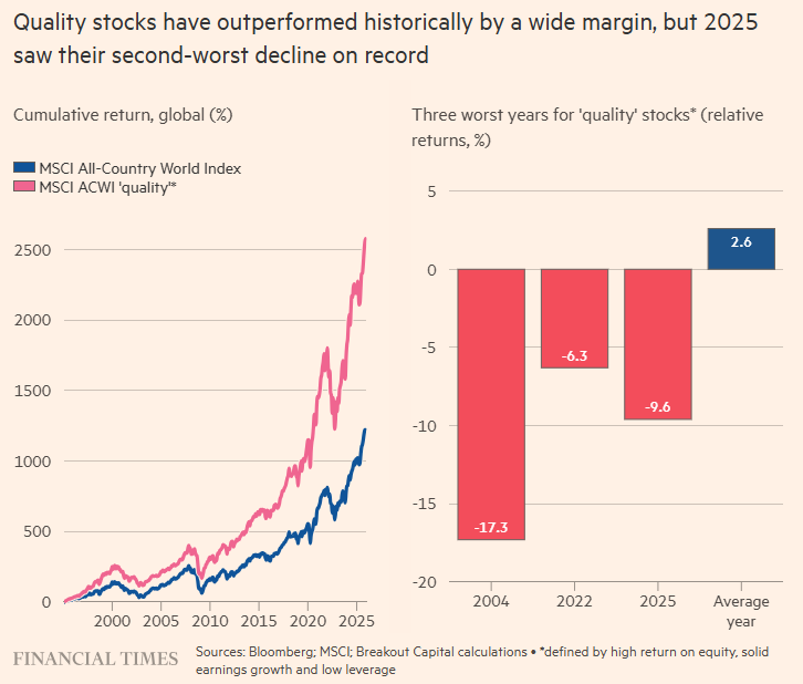 文章指出,AI热潮推动市场风险偏好上升,资金追逐的是高波动、高杠杆、低盈利的“概念型资产”,而传统意义上的质量股——即高ROE、盈利稳定增长、杠杆低的公司——在过去一年遭遇明显冷落。作者认为,随着市场对泡沫风险的讨论升温,投资者可能重新回归“更稳健的盈利与更真实的现金流”。文章尤其看好一类资产:具备高质量属性,但估值处于历史偏低水平的股票群体。根据文章描述,这类资产目前集中在工业、金融与部分可选消费领域,若宏观波动加剧,可能成为2026年资金的“安全去处”。
